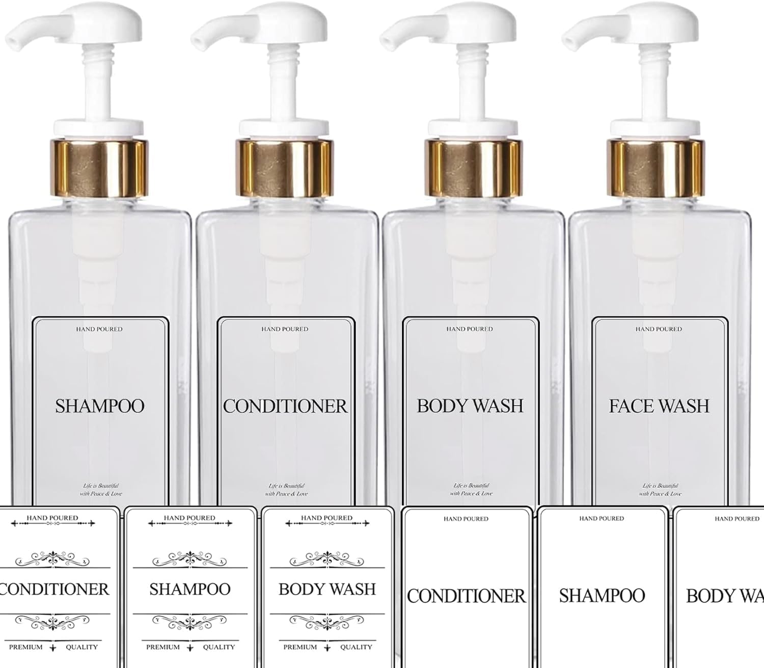 - 【Reasonable Capacity】 Each dispenser bottles holds 27oz large capacity to meet the whole family essential need. Box includes: labels to identify which lotion you use: Shampoo, Conditioner, Body Wash and Soap.